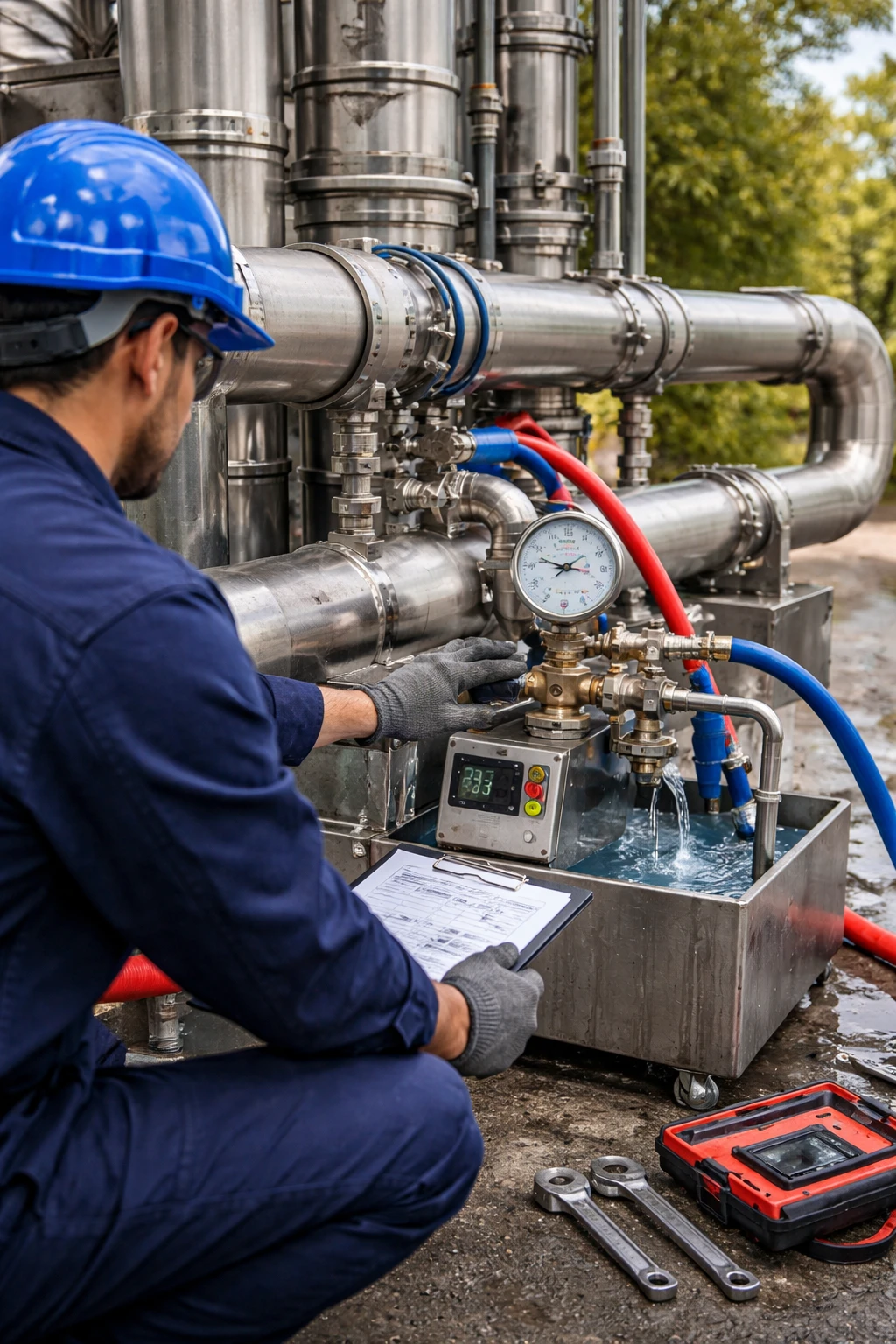 Realizamos pruebas hidrostáticas para verificar la estanqueidad y la resistencia mecánica de sus equipos. Este procedimiento es vital tras realizar reparaciones estructurales (como el cambio de tubos que se ve en nuestras fotos).